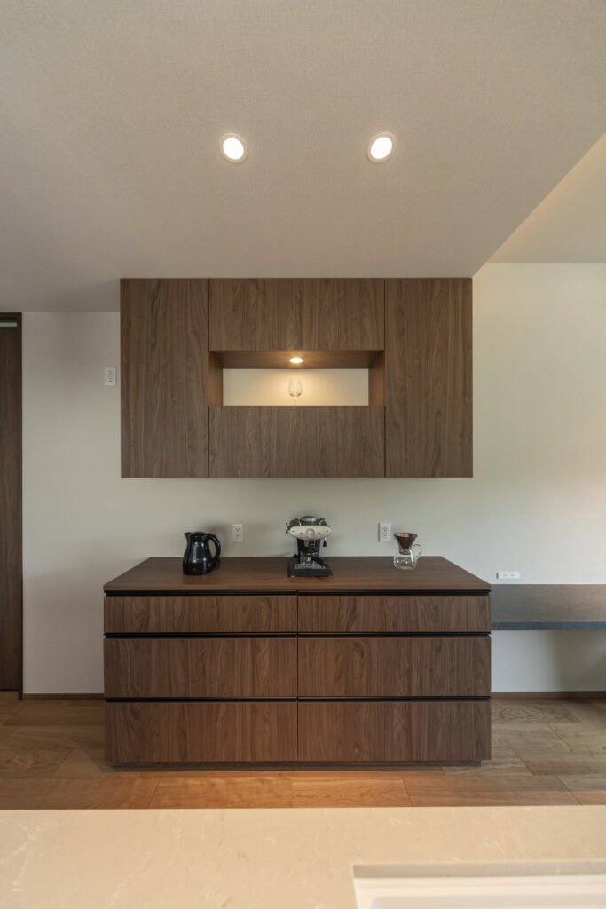 大容量の引き出し収納で生活感を隠しつつ、吊り戸棚の中央にはダウンライト付きのディスプレイスペースを設けました。
