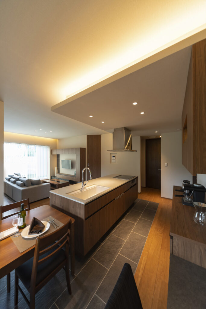 LDKの主役は、温かみあふれるウォールナットの造作キッチン。